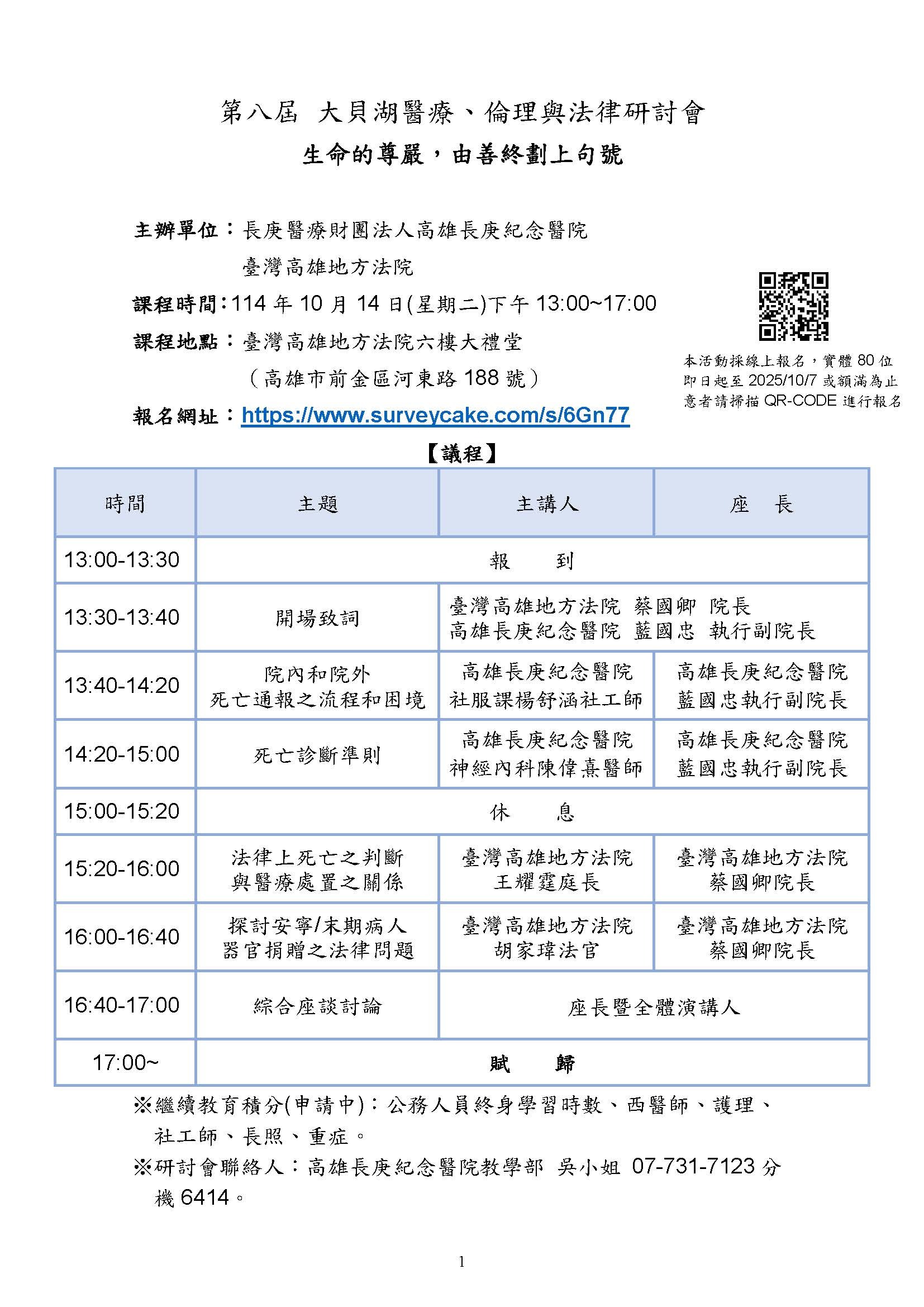 20251014【校外研討會】生命的尊嚴,由善終劃上句號--第八屆大貝湖醫療、倫理與法律研討會